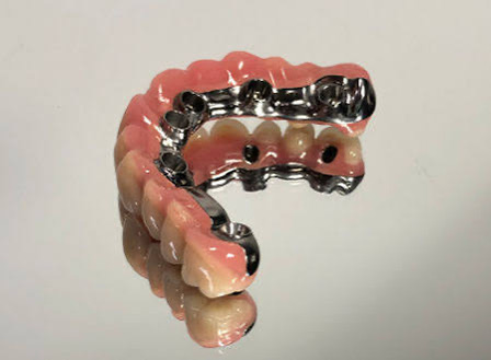 Le bridge sur pilotis constitue une solution économique de réhabilitation partielle ou totale sur implants. L’armature, en NiCr ou en titane, est réalisée de façon traditionnelle ou par CFAO et la finition est en résine.